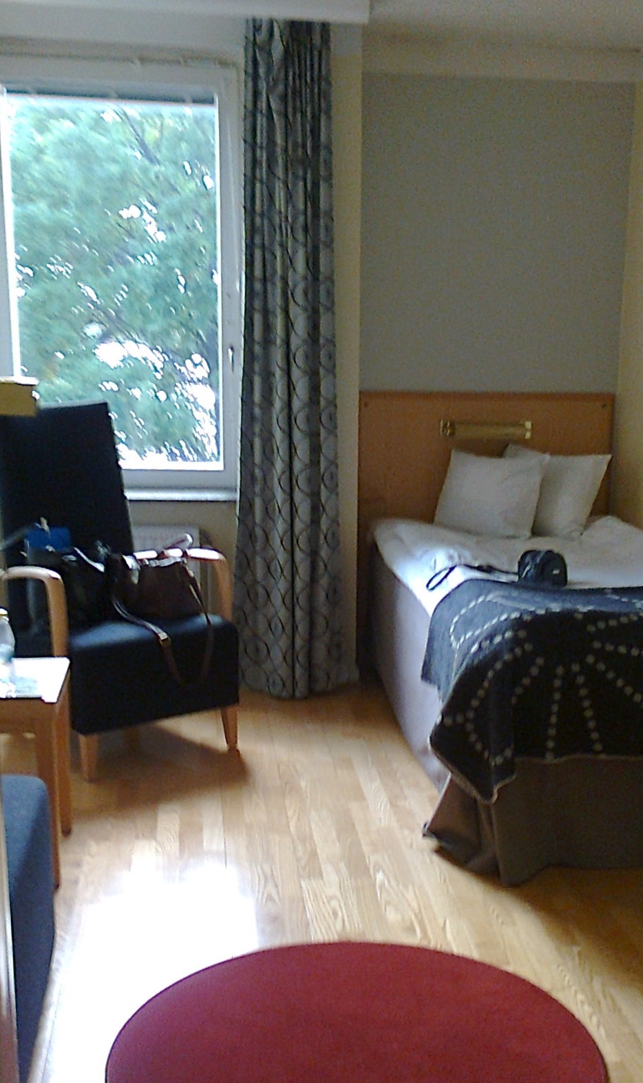 Klockan 21 började folk bryta upp, så jag hämtade min dator och gick ner till mitt rum, som var litet men fint. Och en otroligt skön säng. Mycket rent och fint. Golvbrunnen i duschen var skinande blank och ren. Ja det var som om ingen annan hade bott där tidigare.Utsikten var kanske inte den bästa, men inte så pjåkig ändå. Fast med tanke på hur det ser ut på baksidan av konferensanläggningen, så