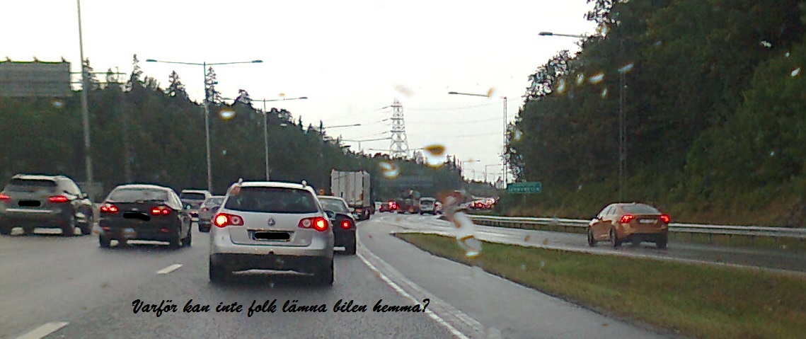 Ja, så var det dags för hemfärd. Regnet öste fullkomligt ner och vägarna blev fyllda av stora vattensamlingar. Speciellt vid Frescati där de bygger för Norra länken och asfalten inte är jämn och fin som på andra ställen. Det var inte så långa köer, fast jag hann inte ända hem förstås… Om det händer, så blir jag förvånad. Köer är en del av vardagen. Om inte in till institutionen, så hem ifrån den. Alltid köer!