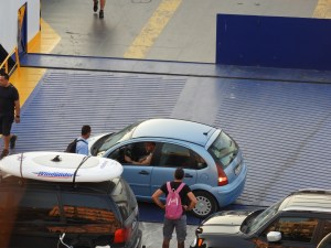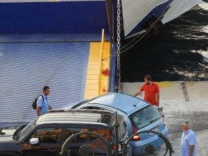 Jag har lite rolig humor, men när Thassos II kom till hamnen, såg det ut på detta viset. Det ena var att det stod en enda liten bil. Det andra att två bilar stod i vägen. Vad gör man då? Jo, man flyttar helt enkelt färjan lite åt ena hållet eller backar den. Och efter en hel del trixande löste de situationen.