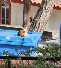 Den här katten är boende i området. Idag kom den springande och satt sig på sopcontainerna. Den satt i godan ro. Helt plötsligt blev den vaksam. Det syntes att den hörde något. Fram kom en annan katt och gick förbi utan att märka katten ovanför. Men den å sin sida hörde bara att någon kom, trots allt spikande, borrande mm. Till slut fick den ro och lade sig. Många katter ligger på biltaken och inte under bilarna som hemma i Sverige. Här är en förklaring! Sen passade jag på att ta ett kort på den fina blomman utanför porten.