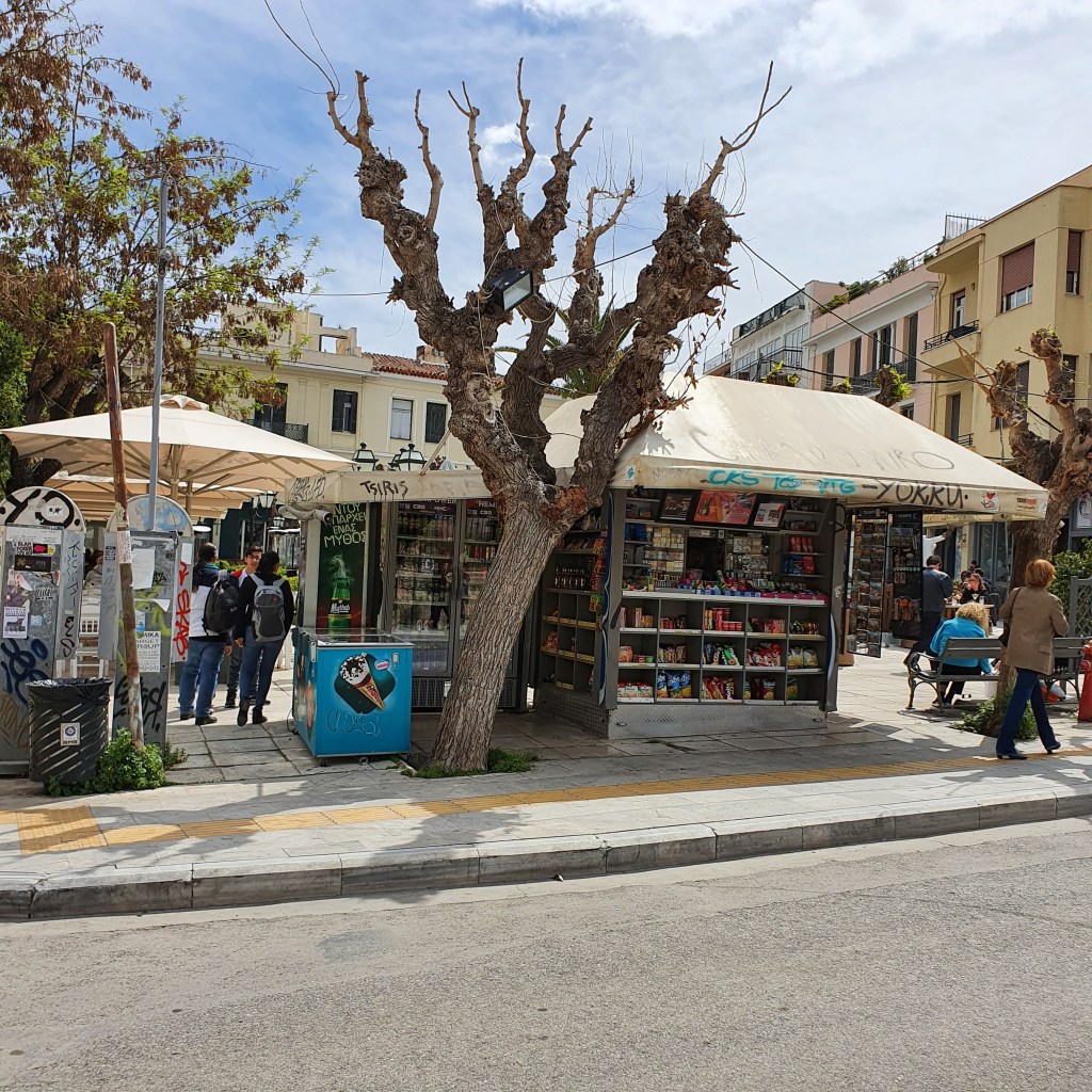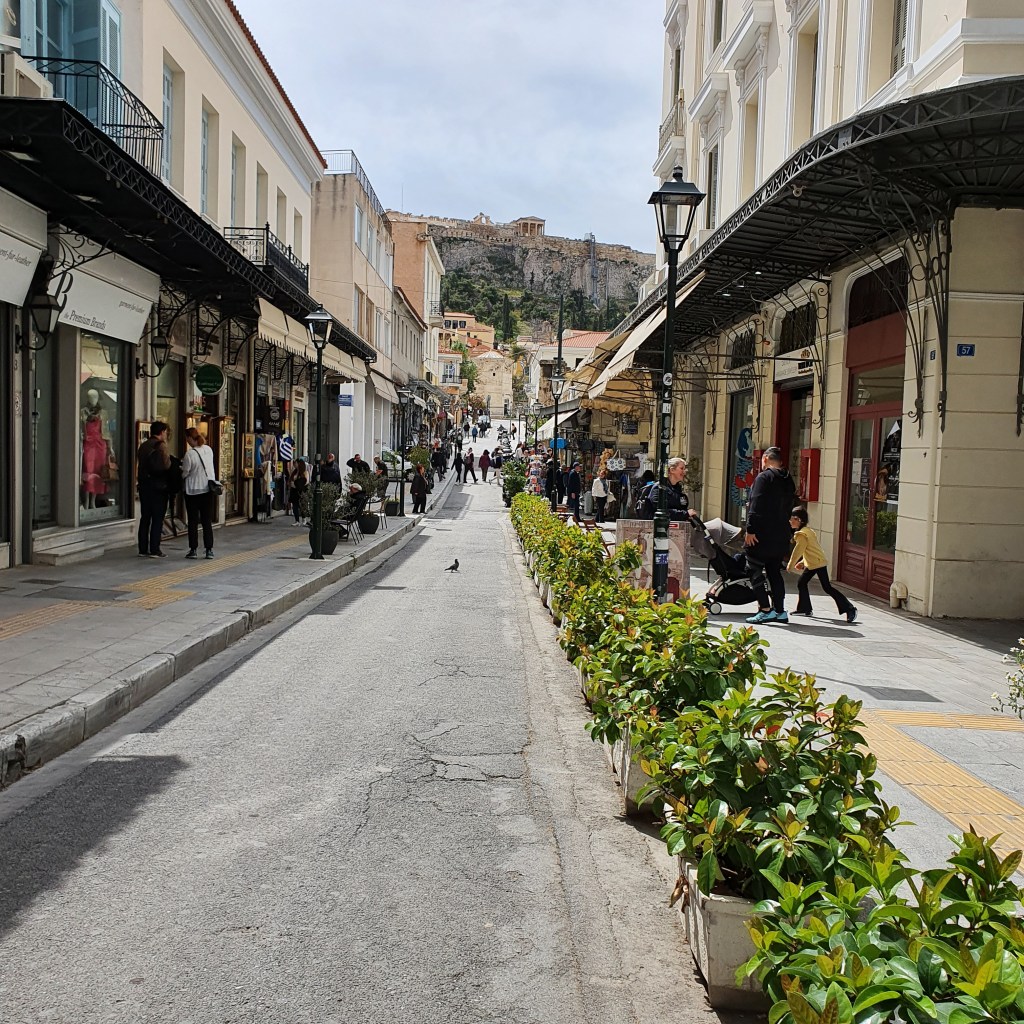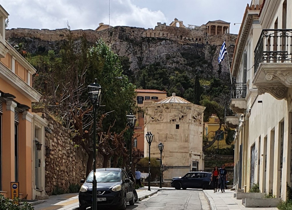 Ja, då var jag på väg ner mot Bazaar för att köpa vatten, hårgele, bröd och apelsinjuice. Det var lång kö till kassan. När jag kom ut därifrån blev det stressigt. Folk hetsade för att komma förbi mig. Var farligt nära gatan flera gånger. Men jag kom helskinnad ner till den romerska agoran. Jag såg den på håll, för att gå runt bland ruinerna kände jag inte för. Den är dessutom inte lika välbevarad som Atens agora är. Den hinner jag tyvärr inte besöka. Inte heller Akropolis. Det skulle ta en halv dag att bara komma upp. Men har varit där några gånger tidigare. Galleriet innehåller lite blandat, både av agoran, ovanför den, samt Vindarnas torn.