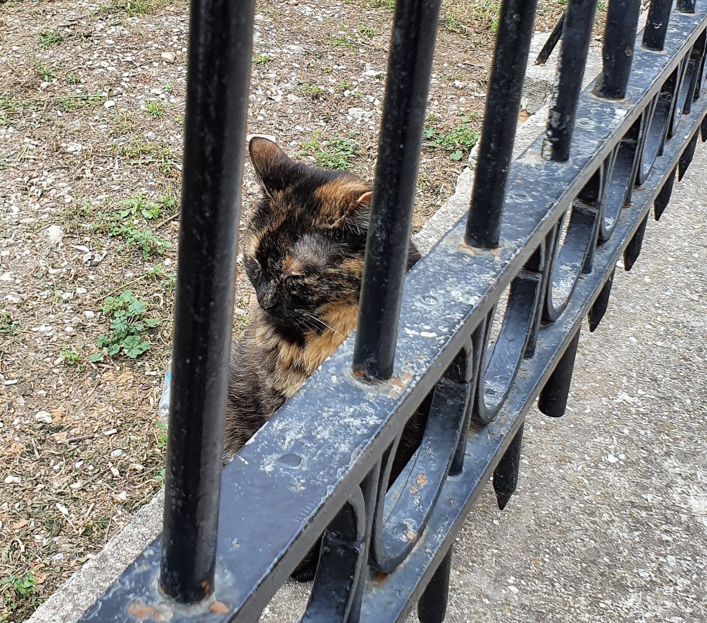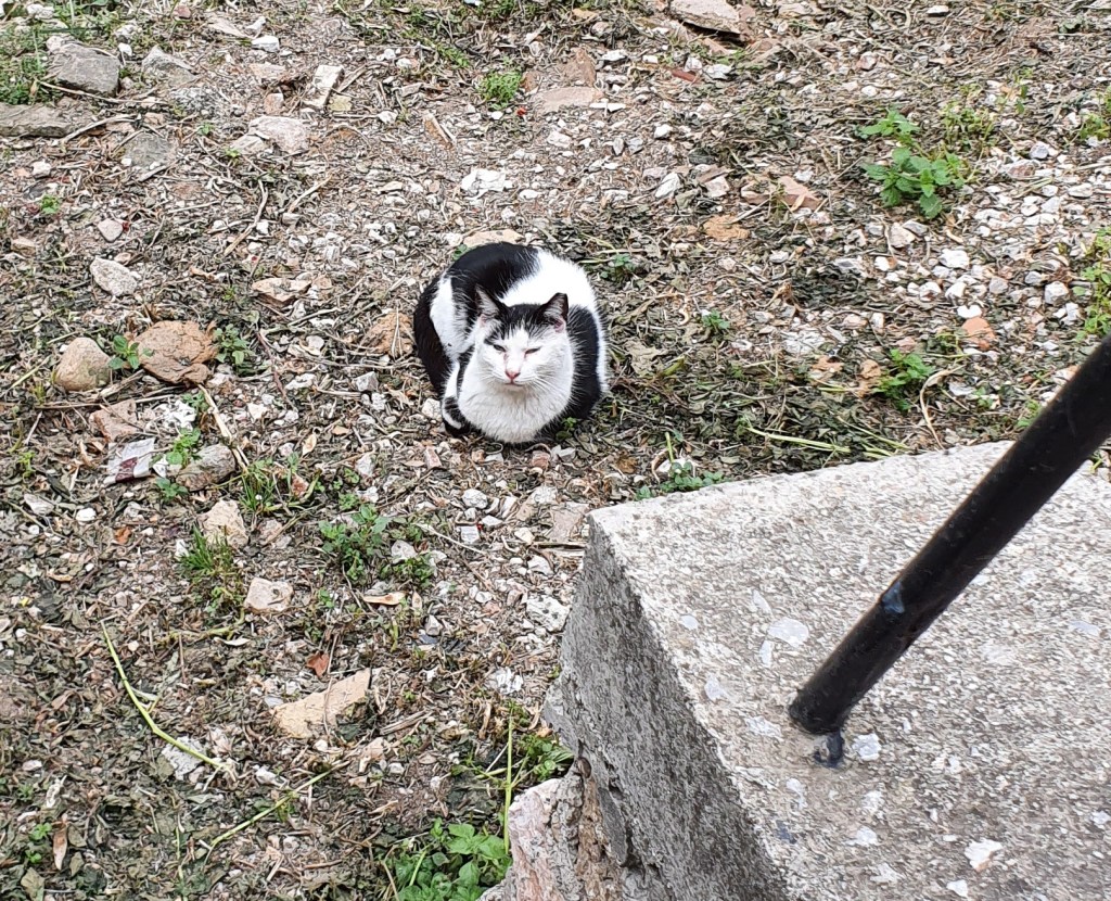 Jag stannade till vid Taverna Platanos. Det satt en katt på muren bakom staketet. Va, har Siri flyttat från Kavala. Men när jag kom närmare såg jag att det var Siri den äldre, mycket tröttare och ville inte bli fotograferad. Men fick en bild av henne till slut. Men inte ögonkontakt. Men det låg en annan katt nedanför. Den hade inget emot att bli fotad. Sen när jag kom tillbaka från kiosken, poserade Siri inför några ungdomar. De fick finare bilder. Men ska det vara så, tänkte jag inte försöka igen.