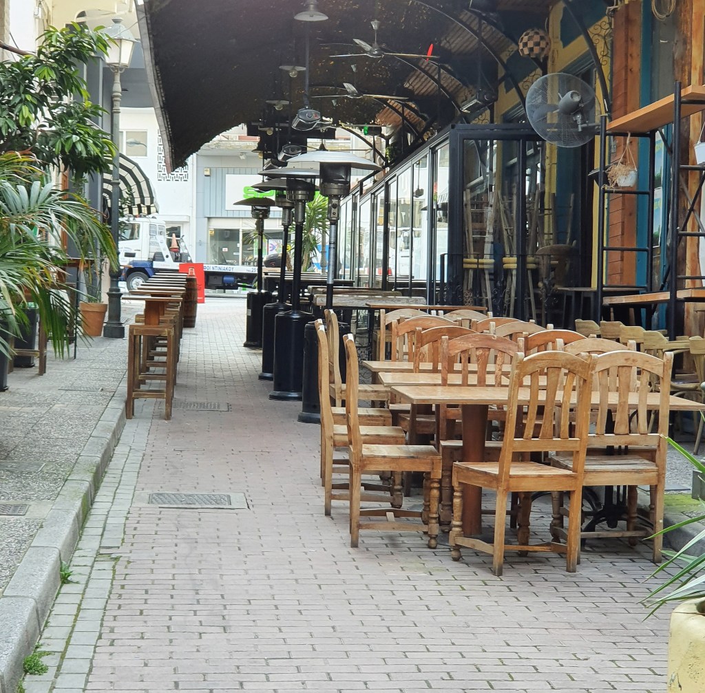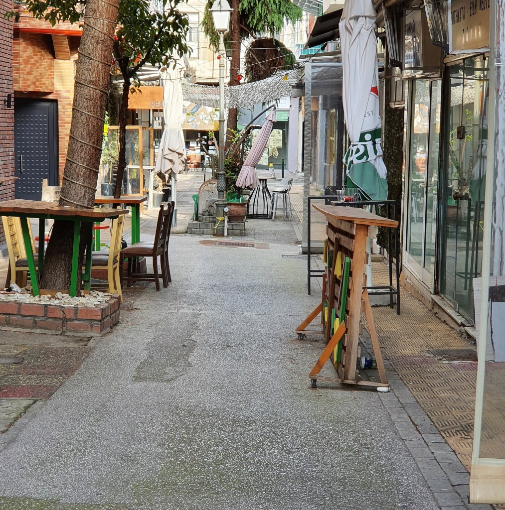 Det finns inte en människa, katt eller fågel. Knappt en bil på Odos Omonias. Det var jag och de som håller rent. Efter de här dagarna med liv och rörelse, folk som sitter i gathörnen, dricker kaffe och pratar. Alla som besöker tavernerna. NU känns det riktigt, riktigt ödsligt.
