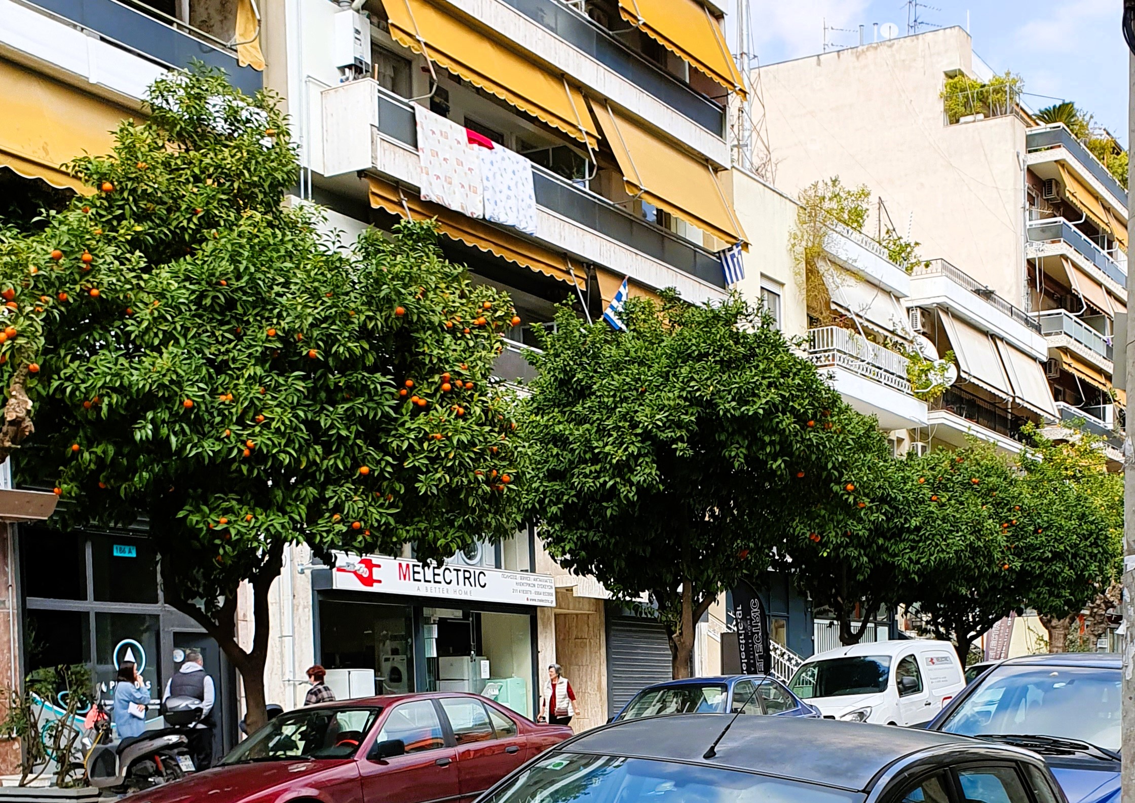 Igår var ju så gott som alla affärer stängda, som de alltid är på söndagarna, så då handlade jag i en öppen lite mindre affär. Massoutis som var stängd igår, finns några kvarter från där jag bor. En fantastiskt fin promenad. Apelsinträden står på rader på så gott som varje gata. De släpper sina till synes fina och färska apelsiner, men det kanske bara är för syns skull numera. Troligen impregnerade med avgaser. Men fint är det.