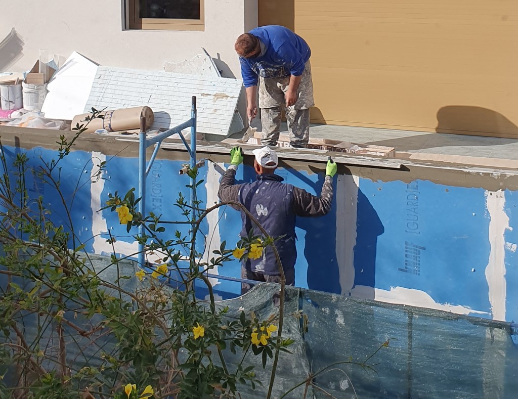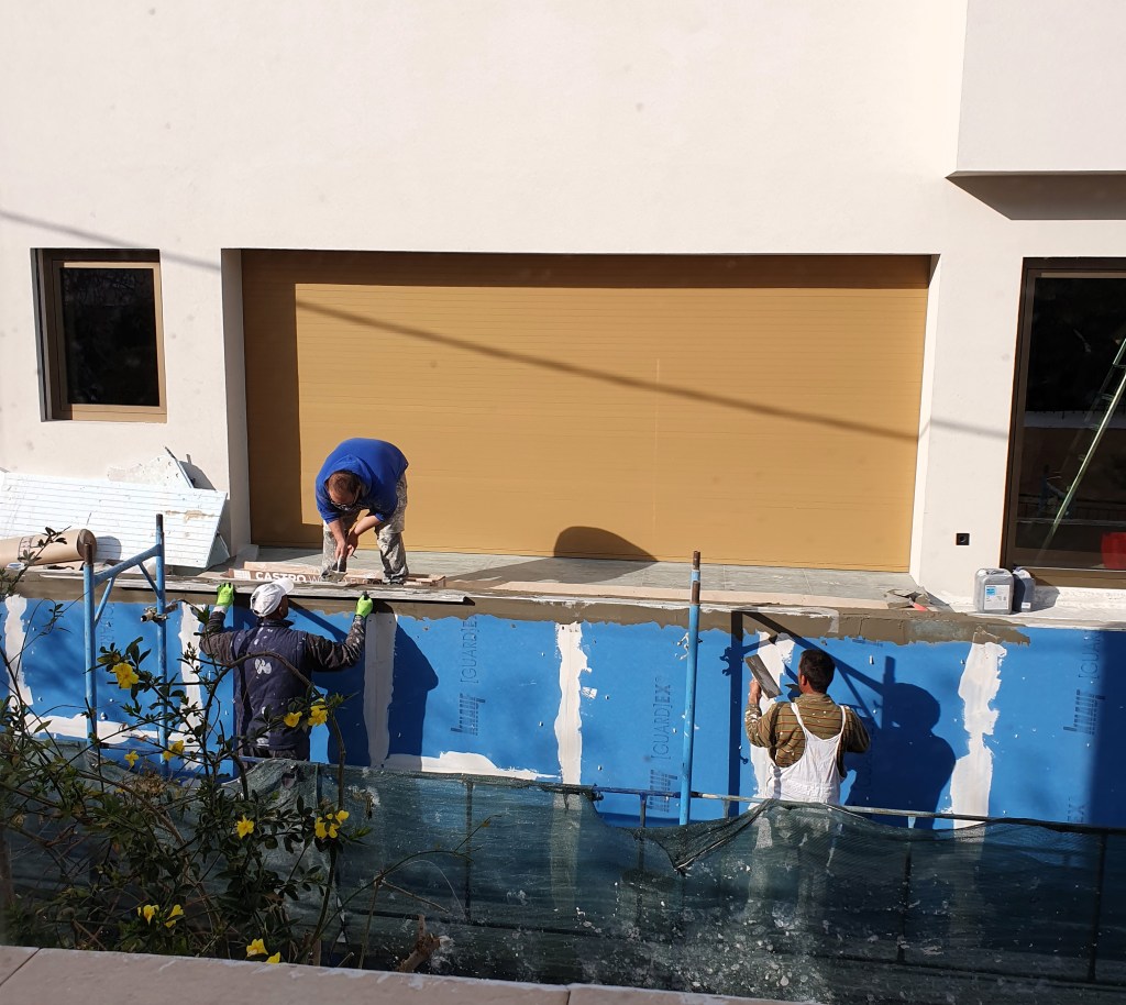 Sov fem timmar och vaknade kl. 3, och kunde inte somna om. Men tiden gick, och jag mötte gubbarna när de lastade in material i porten. Klockan var då åtta och lektionen började kl. 9.30. Sitta en stund på Plateia Varnava är inte aktuellt eftersom den ligger i skugga. Men jag fann några trappor framför en port där jag kunde vara en katt som söker varenda liten strimma sol. Tog tid på mig. Till slut kom jag till skolan, och där höll en person att borra i gatan och gubbarna jobbade. De gör väl de sista nu, för det var en dam som stod och tvättade fönster. Jag smygfotade gubbarna.