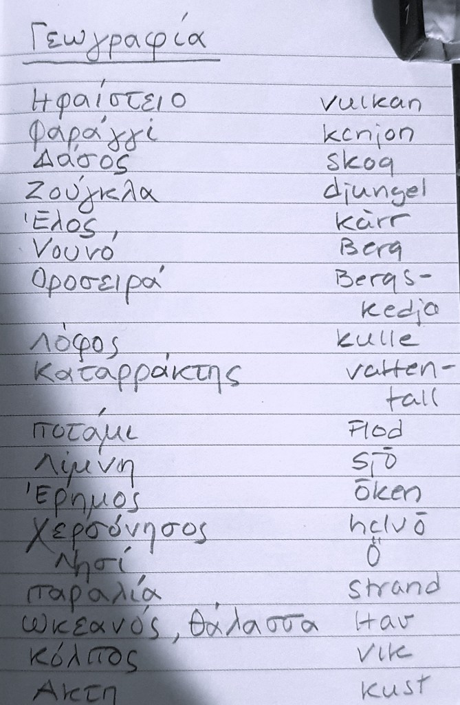 Jag valde att slappa och sova. Studierna fick anstå till igår. Men det var svårt att hitta ingången till möjligheten till att lära sig. Till slut hittade jag lösningen på nätet. Så nu har jag suttit i många timmar och skrivit ner kategori för kategori de grekiska orden och svenska översättningen. Grejen är att man viker sidan, så den svenska översättningen inte syns, och tar fram den om man inte kommer ihåg ett ord.